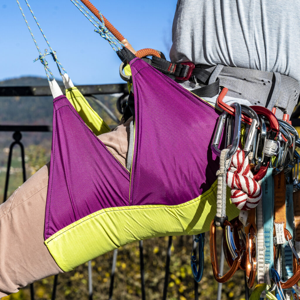 Il s’agit d’un harnais souple en tissu, qui s’utilise en complément de votre baudrier et de votre longe pour éviter le cisaillement au niveau des cuisses et augmenter le confort lors des phases de suspensions longues.