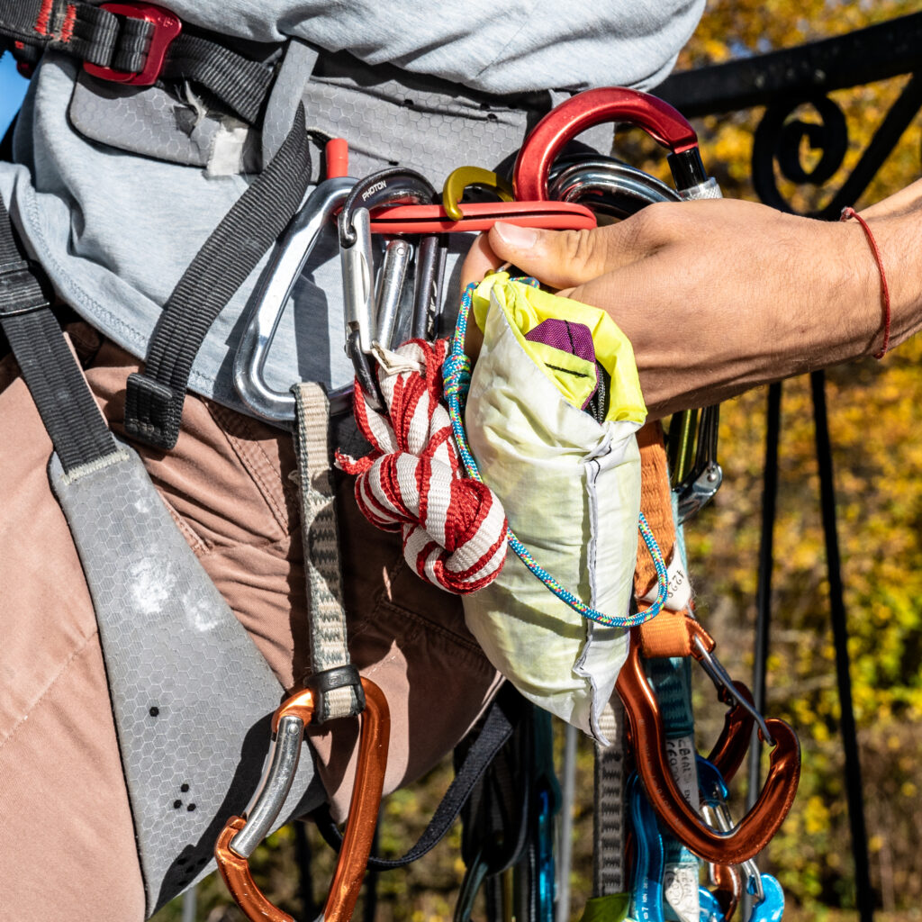 Un mini-machard et un mousqueton sont livrés avec la sellette, et permettent d’accrocher la sellette sur votre longe.
