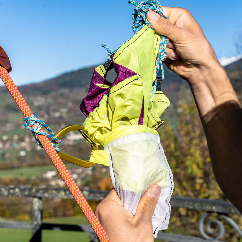 Le compromis solidité/légèreté a été difficile à trouver, et c’est un assemblage de nylon et de parapente upcyclé qui a été choisi.
